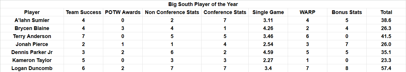 Reasoning for this Metric Formula: This metric formula, at least in my opinion, best reflects what you need to win Big South Player of the Year. Last year showcased, it’s not always the best player on the best team that wins the award, hence why I only rated Team Success at 10%, the same as Big South Player of the Week awards as I believe those CAN factor in but SHOULDN’T decide the award. The things that should reflect that award are represented with higher weights, your stats SHOULD matter, with Conference Play being more important as THAT is what decides your seeding and chance to make the Big Dance and WARP shows if you are TRULY better than your peers.