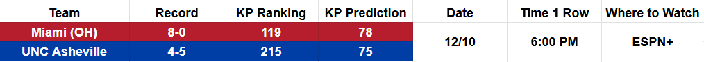 Dec 10th - 6pm EST - Miami (OH) at UNC Asheville