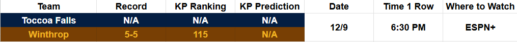 Game Breakdown: Winthrop should steamroll Toccoa Falls pretty handedly. Winthrop has the talent gap, size gap, and home court advantage compared to Toccoa Falls, and really any Non D1 buy game team.