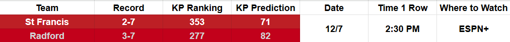 Dec 7th - 2:30pm EST - St Francis (PA) at Radford