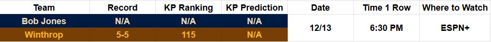 Game Breakdown: Much like the Toccoa Falls game above, I do not think Winthrop will have any trouble with Bob Jones. Winthrop just has more talent and size than Bob Jones, along with home court advantage.