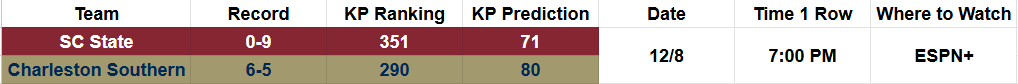 Dec 8th - 7pm EST - SC State at Charleston Southern
