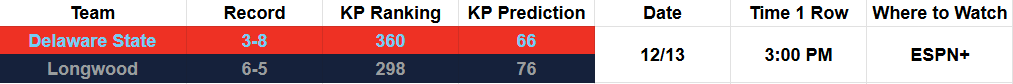 Dec 13th - 3pm EST - Delaware State at Longwood